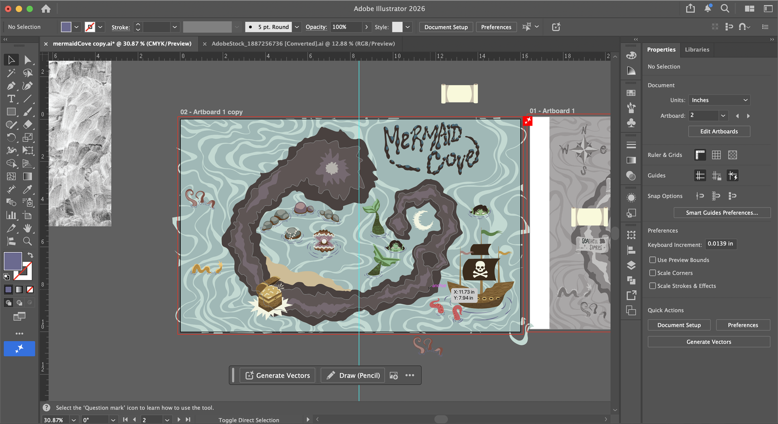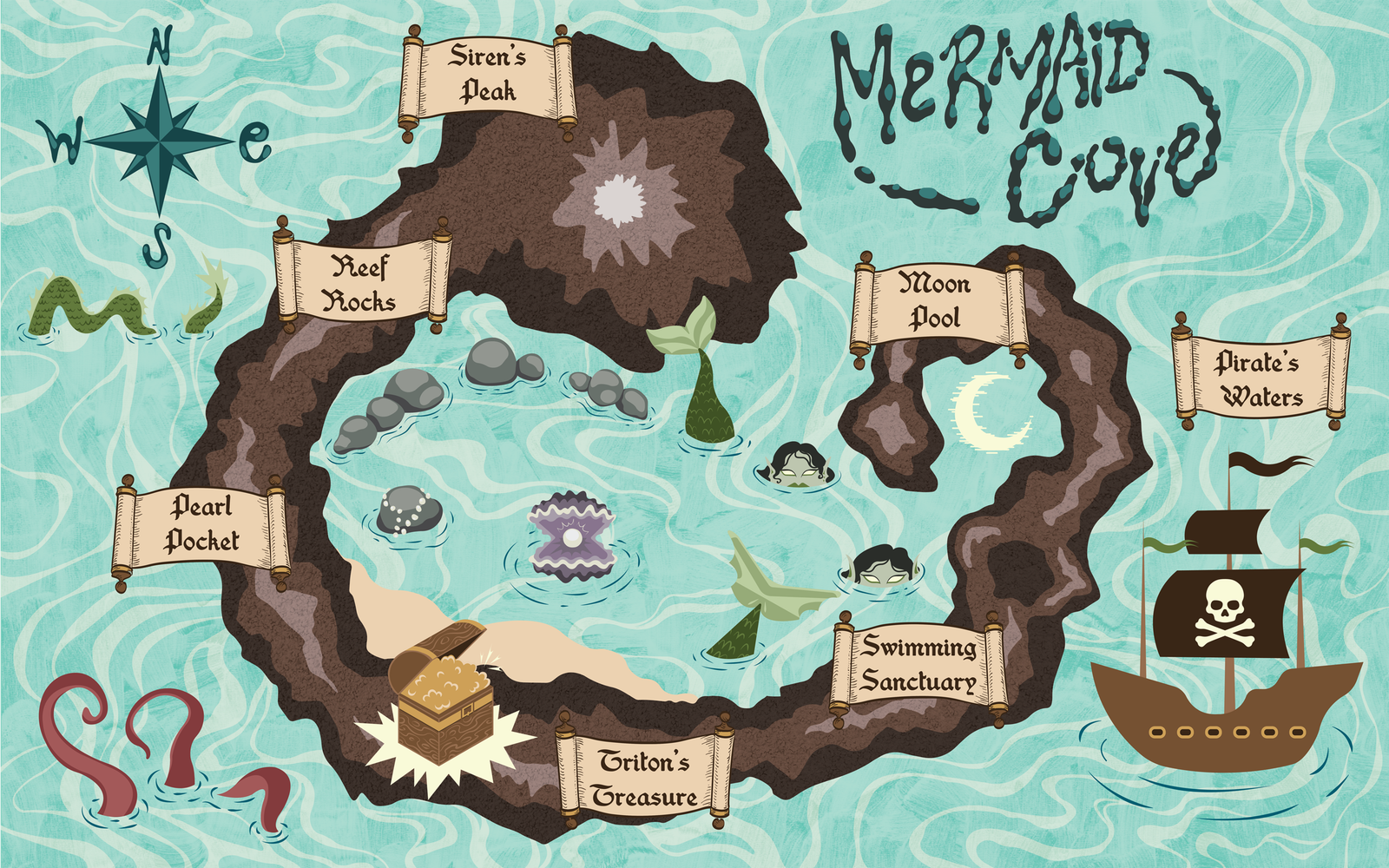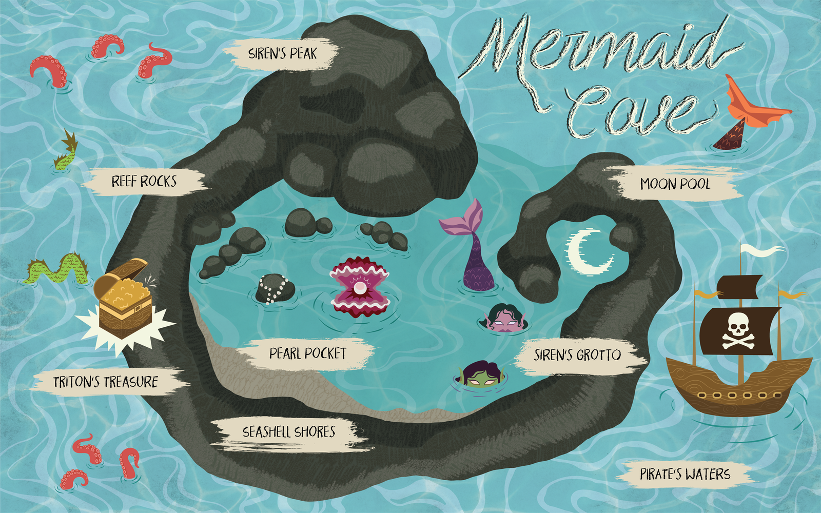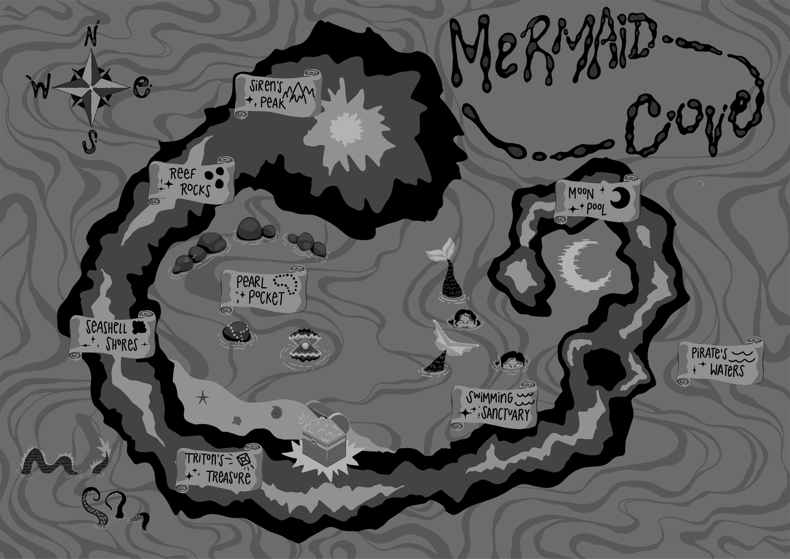 Mermaid Cove is a project from a digital illustration course. The prompt was to create a map of any kind. Since mermaids were a huge part of my childhood interests, the choice seemed obvious. This map is intended to be used within a children’s book. Due to this purpose, important information such as objects and labels are not placed in the center of the image, since this is where the pages would be folded and bound. As far as process, I began drawing a notan thumbnail within Procreate, then built out the map with colors in Adobe Illustrator.